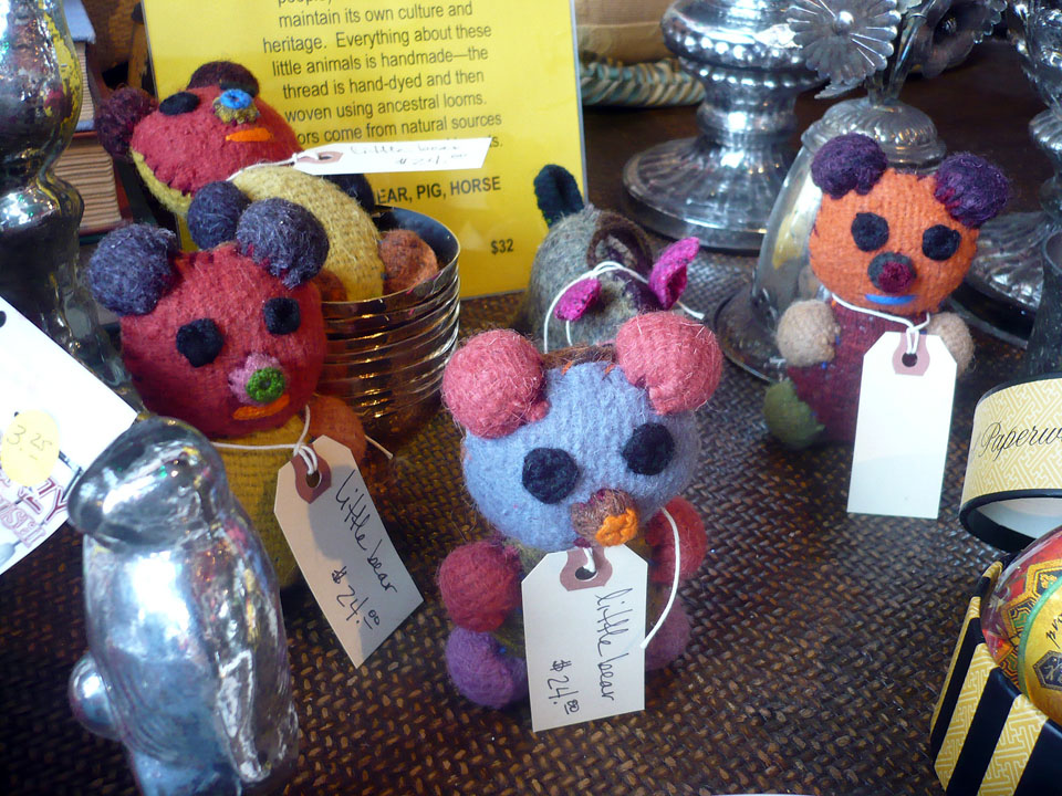 At the foot of the rising ground forming the western wall of Kenya’s magnificent Great Rift Valley lies the tranquil farming community of Njoro. Here Kenyan women gather wool from the Kenana Farm and all neighboring farms as the need demands. They wash, dye with all natural plant dyes and mothproof with natural pyrethrum flower (like a daisy) all of the wool and then spin it on old bicycle wheels. Then they make unique and precious hand-knit animals. Their profits have funded a free gynecological clinic with HIV and AIDS testing for all the women, education for their children and a literacy program for the women.